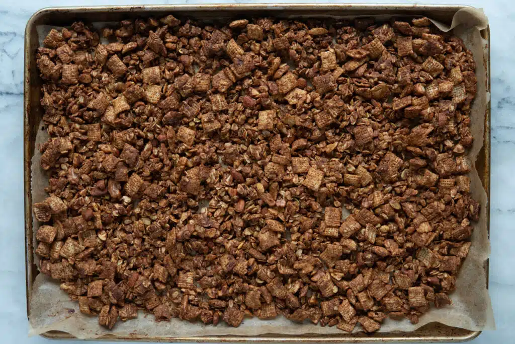- Add the chex, oats, nuts/seeds, cinnamon, and salt and mix with a rubber spatula until evenly combined. Transfer to the baking sheet and spread out into an even layer.