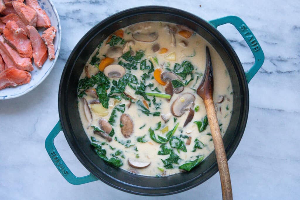 - Once the salmon is done, continue to simmer for another 5-10 minutes or until the potatoes or rice are cooked through.