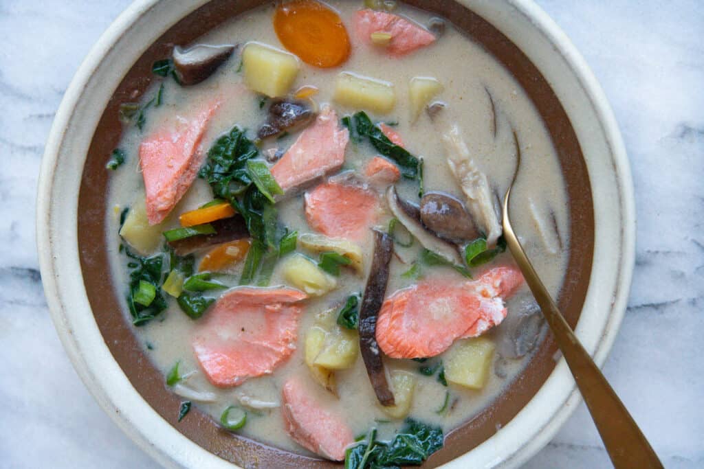Salmon, veggies and potatoes get simmered in a gingery aromatic coconut broth for a cozy, Thai-inspired soup. The salmon is perfectly flaky, the potatoes are creamy, and lots of veggies and greens pack in fiber and nutrients. A final squeeze of lime balances out the richness from the coconut milk. Both the veggies and the protein you use are very adaptable – check out the substitutions section for ideas.