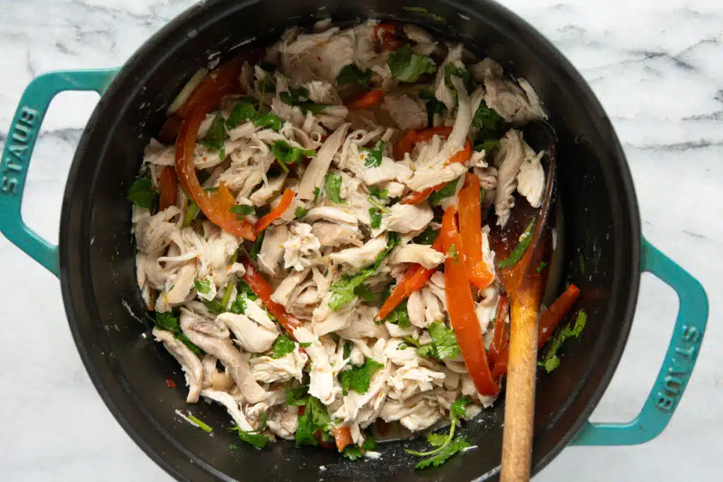 - Shred up the chicken and return to the pot. Add lime juice and more salt, if needed. It should be a little tangy and well-seasoned.