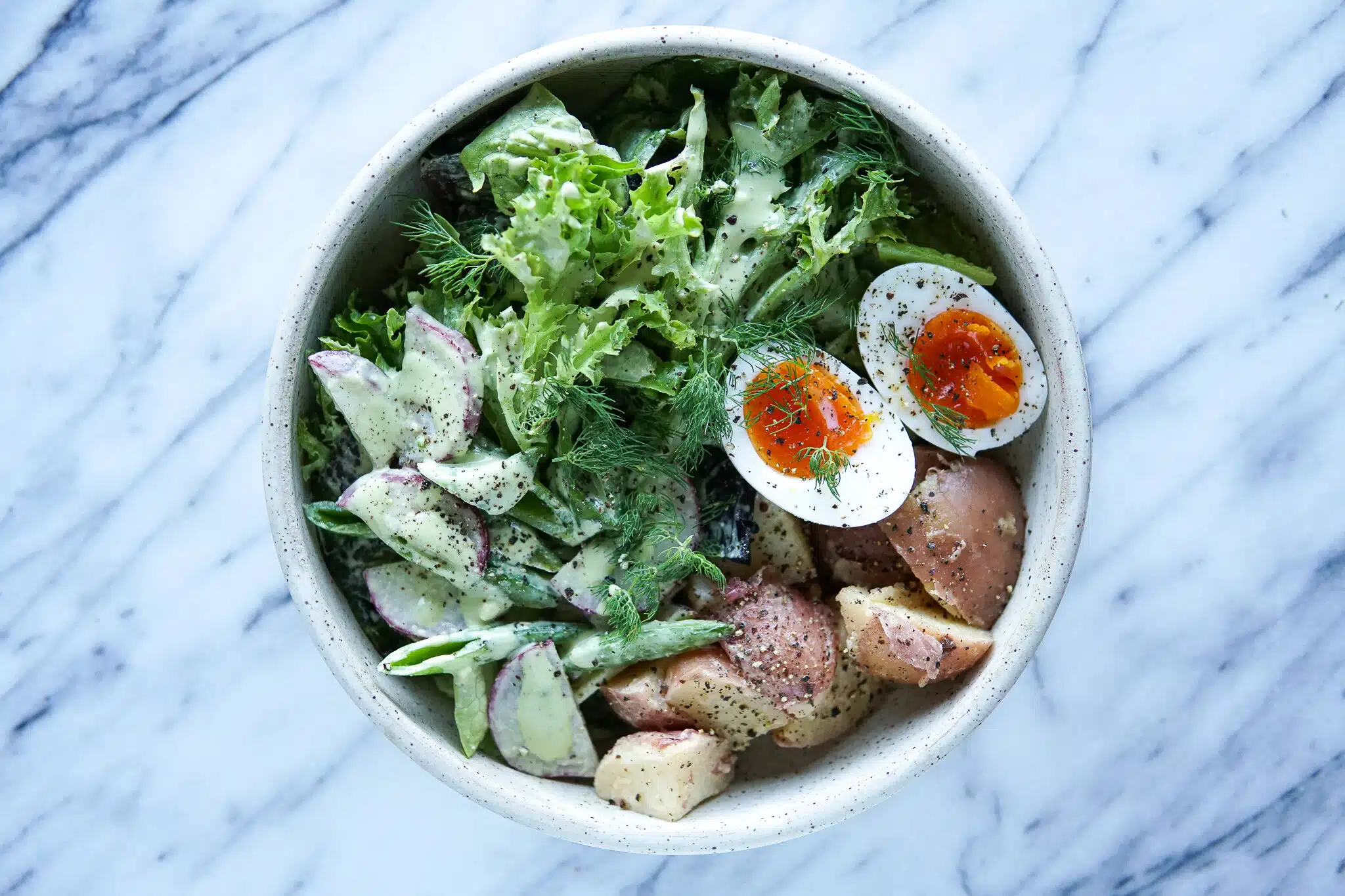 Frisee, radish and snap peas tossed in creamy dill dressing with side of mustardy potatoes and boiled egg.