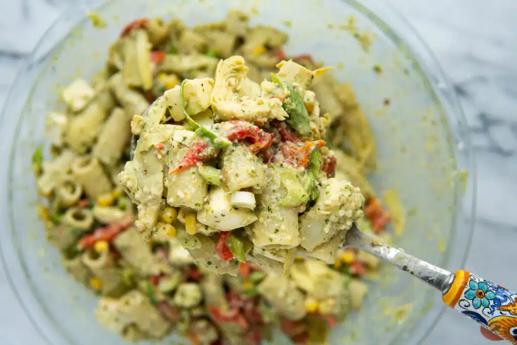 • To a large bowl, add the pesto, tahini, lemon, fish sauce, and salt and whisk until smooth. Add the pasta, artichokes, red peppers, scallions, mozzarella, corn, and parm. Toss to coat. If the pasta is too dry/to make it saucier, add pasta water (or warm water), starting with 1 tablespoon, and toss again.