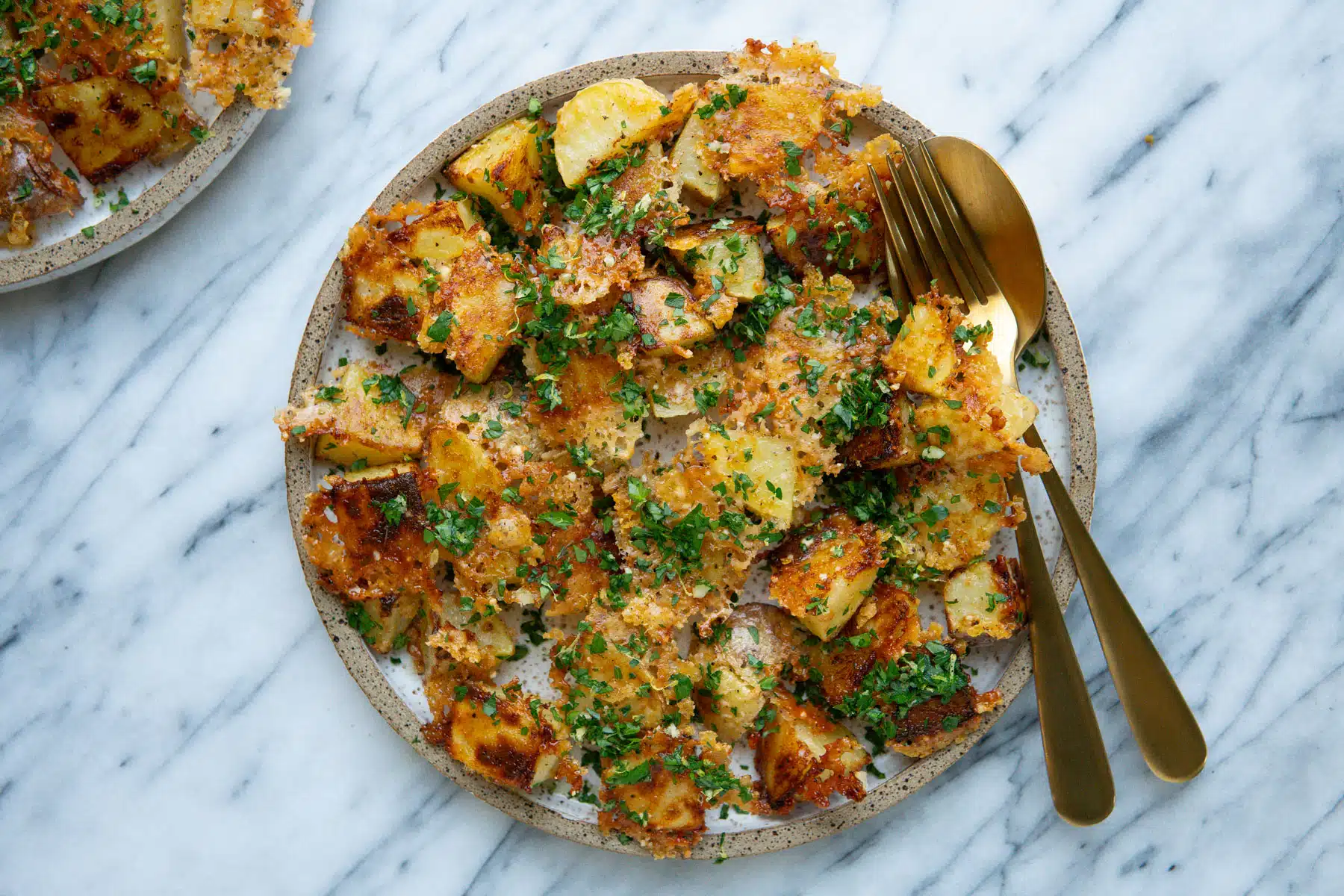 This may be my new favorite way to eat potatoes. The magic happens when caramelized cheese bits get crispy and golden and stick to the bottoms of the golden brown potatoes. A classic gremolata tops it off to add freshness and a garlicky kick. Gremolata is a classic Italian garnish of finely chopped parsley, lemon zest, and garlic.