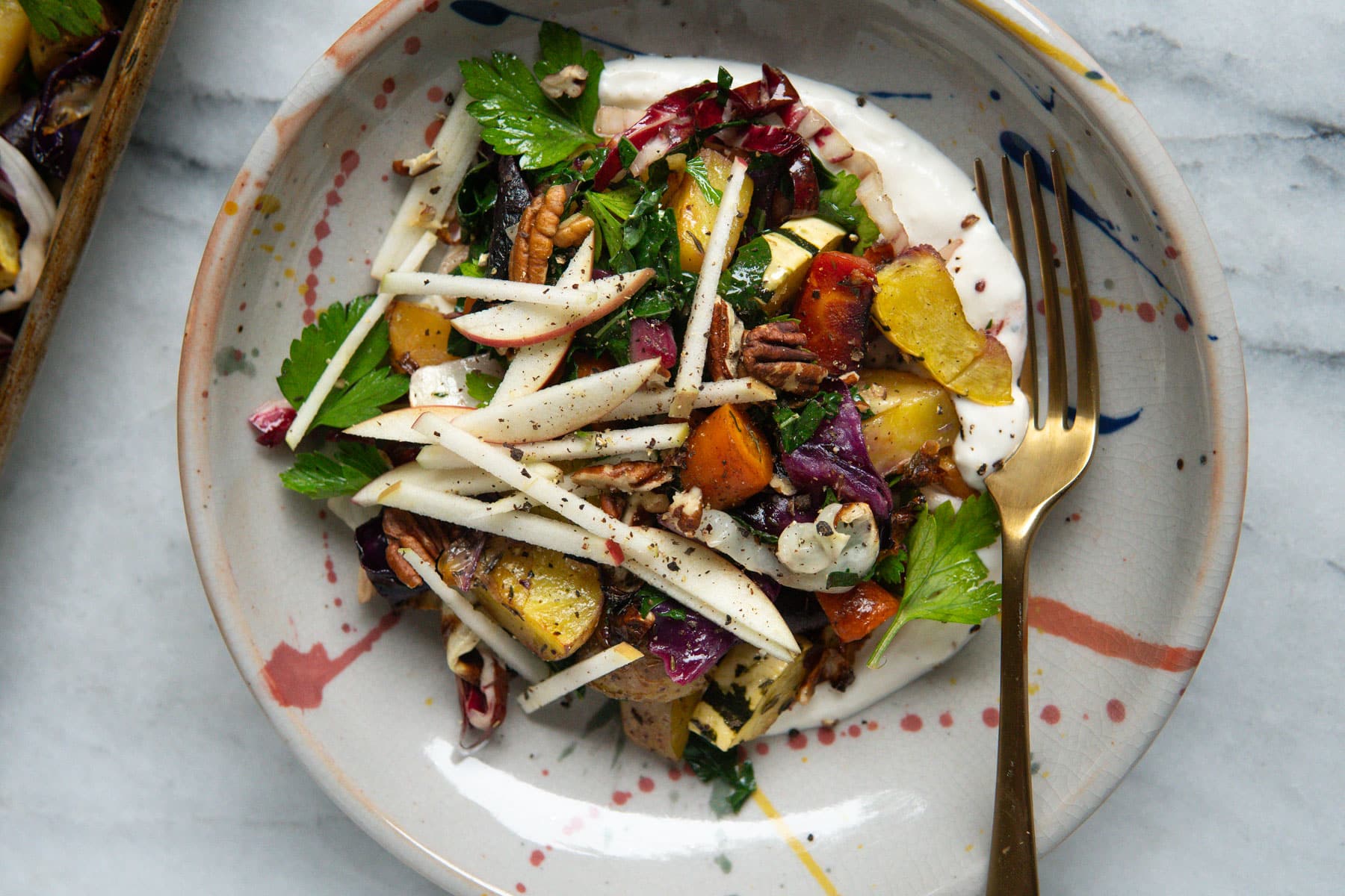 This easy salad roasts a combination of starchy and non-starchy fall veggies until golden and charred. Thinly sliced greens and fresh parsley get tossed into the hot veggies with some vinegar for a zippy, hearty, fiber-full salad. Serve it over a bed of fluffy goat cheese spiked with maple and garlic. Crunchy apples and toasty nuts add texture and a burst of sweetness in every bite!