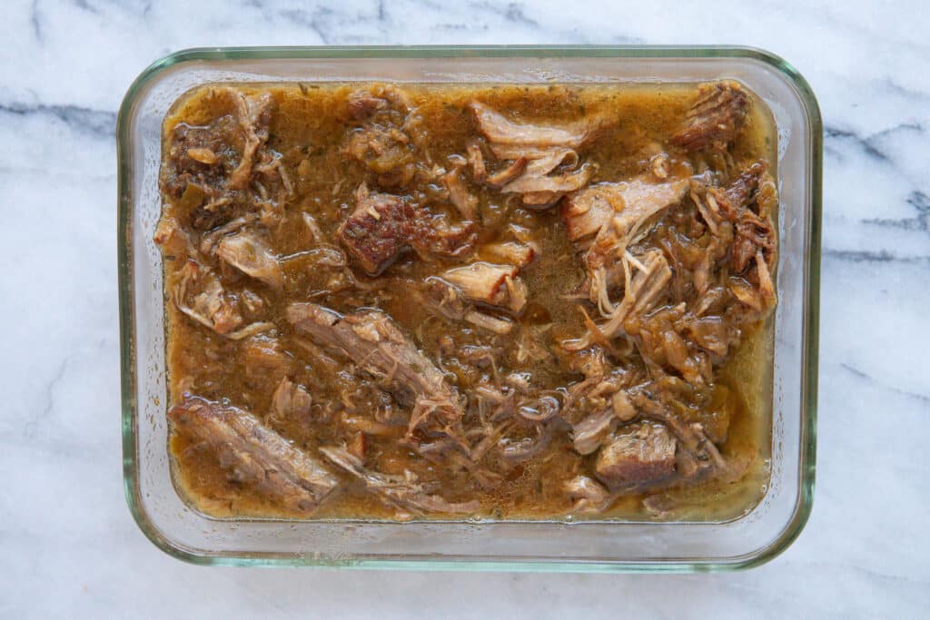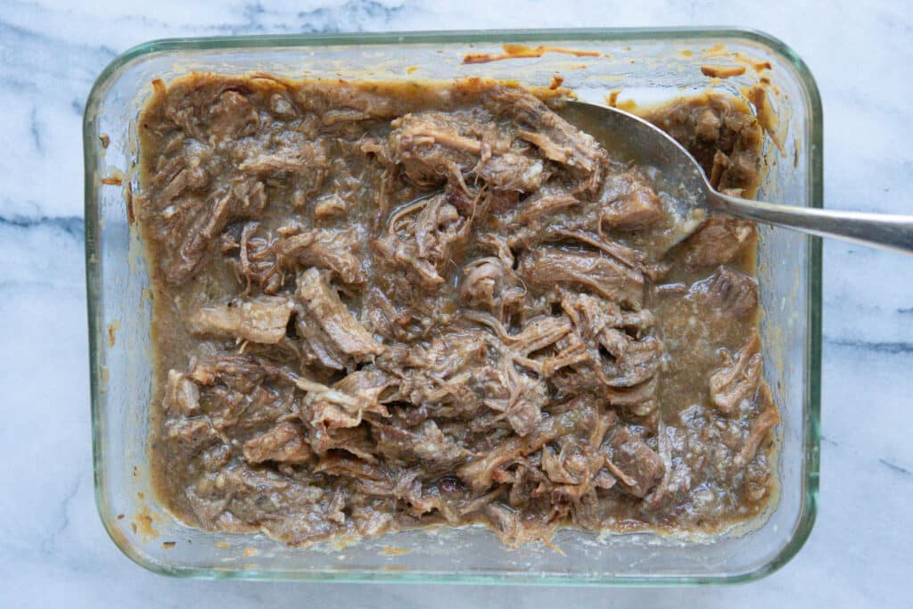 - Once the sauce has reduced, press “cancel”. Return the pork to the pot and stir it to coat in the sauce. You can try to pour or skim off the fat resting on top, though it’s much easier to remove once it has solidified in the fridge, which is why I like to make this ahead.