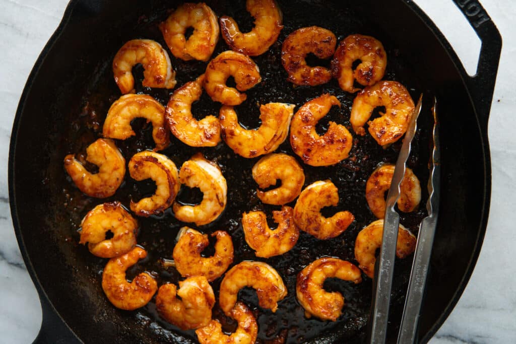 - Add the shrimp in a single layer. Cook for about 2-3 minutes on one side, then flip each over and repeat on the other side or until just cooked through (opaque in the center).
