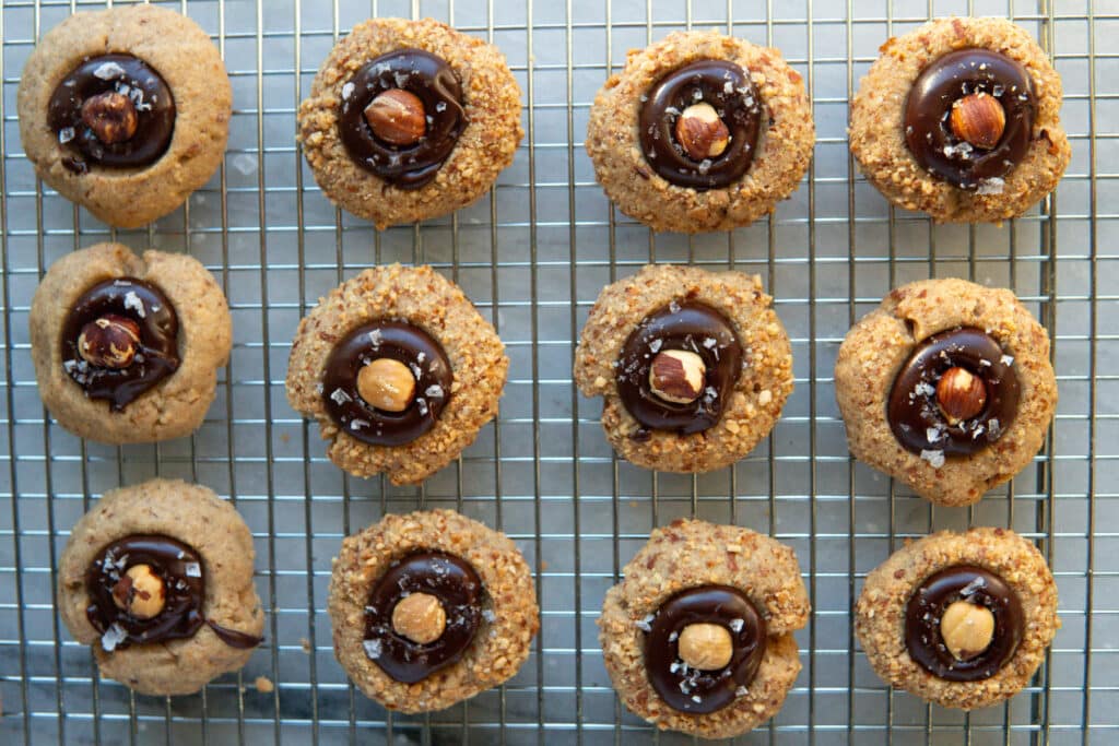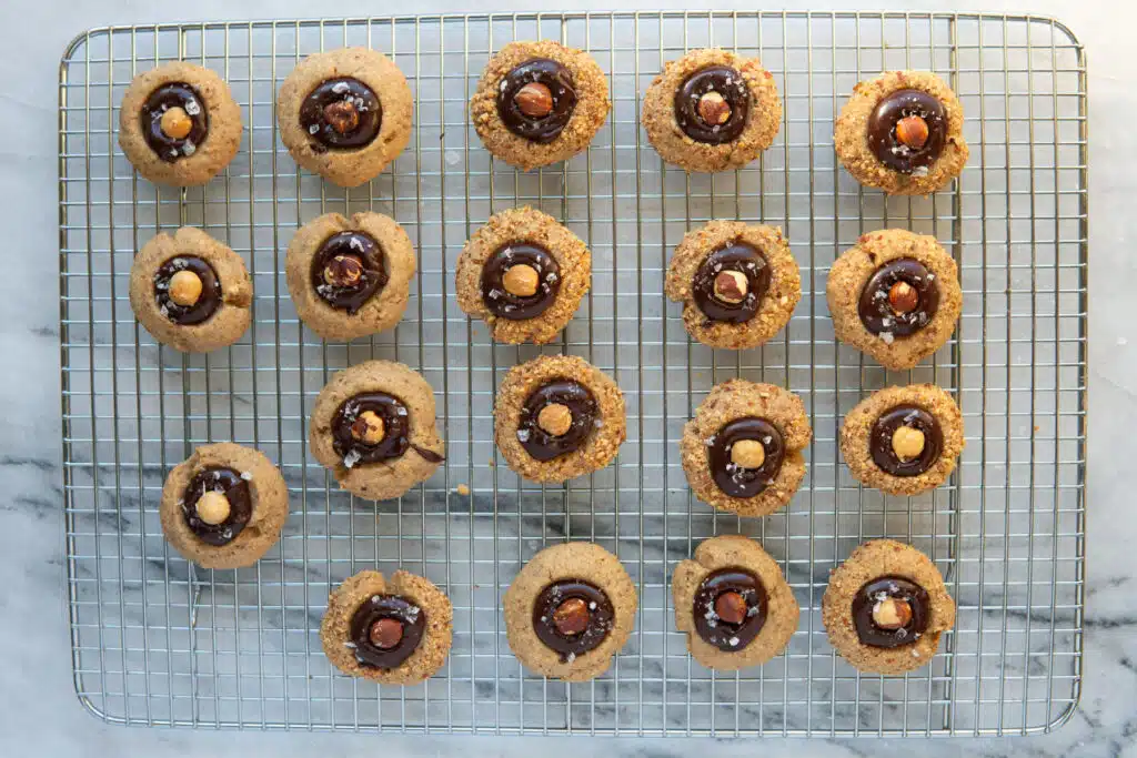 - Spoon the chocolate mixture to fill the center well of each cookie. To decorate, place a whole roasted hazelnut in the center and gently press it down. Finish with a sprinkle of flaky salt.