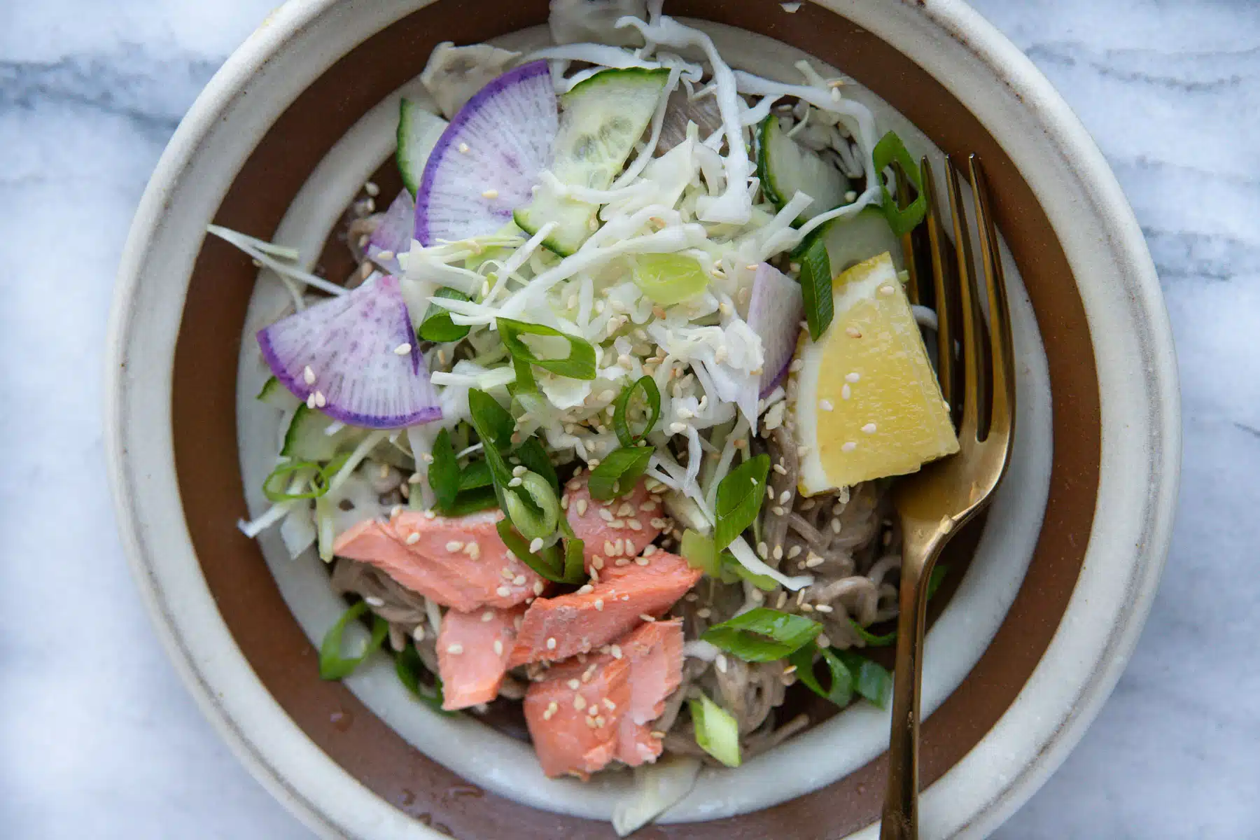 - Serve the noodles topped with salmon, thinly sliced veggies, herbs, and sesame seeds. Squeeze lemon generously all over. Top with chili oil, if using.