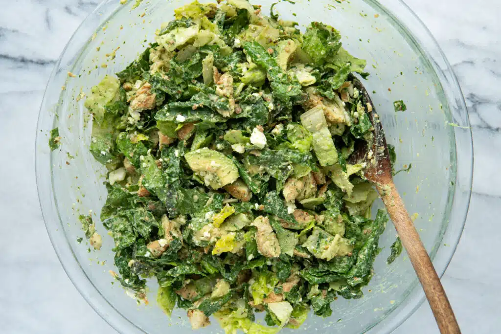 • To the bowl, add the chicken, kale, and romaine and toss until everything is well coated. Add the avocado (see note!) and cheese and toss gently to combine.