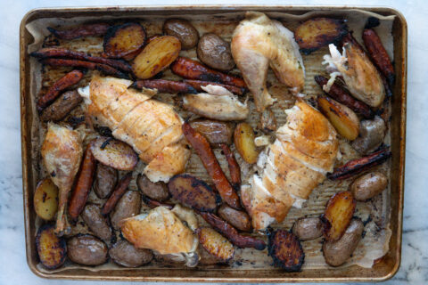 - In a bowl, toss the chicken with the pepper, garlic powder, paprika, and ½ teaspoon salt to coat.