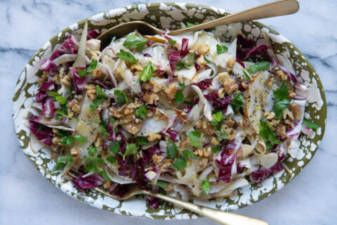 This sheet pan salad will warm you up inside and out. Sweet squash and Italian sausage get baked until beautifully browned and caramelized. Slightly bitter radicchio (or any salad green) gets tossed in a simple vinaigrette and topped with the warm squash and sausage, crunchy sweet apples, and sweet n’ salty spiced nuts that get baked at the same time as the squash. It is SO good!