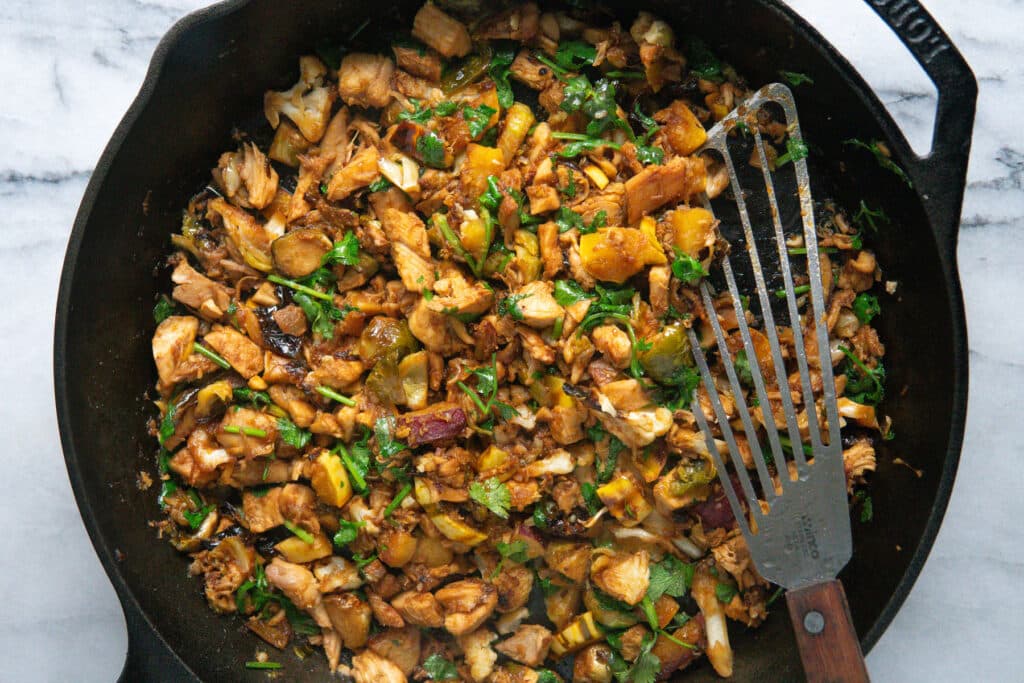 All you need is leftover cooked chopped chicken or turkey and some leftover roasted/cooked veggies to make this speedy meal! Simply crisp up the chicken/veggies in a skillet with ginger and garlic, then pour in a sweet and salty soy sauce to get it nice and caramelized and sticky. It’s delicious as a light meal in lettuce cups or served over a warm bed of rice.