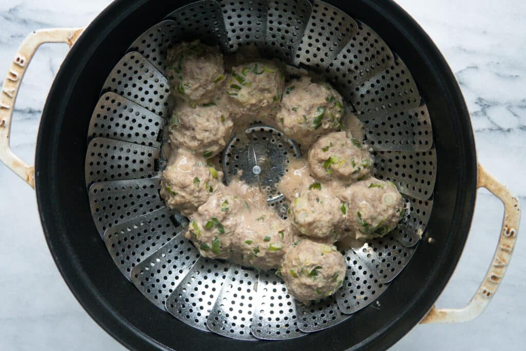 - Arrange the meatballs in the steamer basket (they will be touching). Cover with a tight fitting lid, bring to a boil over high heat, then reduce to medium or medium low heat to steam the meatballs for about 10-15 minutes, depending on the size.