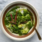 Serve the cod over warm rice and slather with the green curry sauce. Top with herbs (if using), veg (if using), and a very generous squeeze of lime.